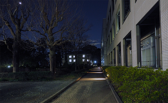 A棟からB棟の開けた位置までは、こんなふうに道をライトが照らしています。意外に暗い道なので